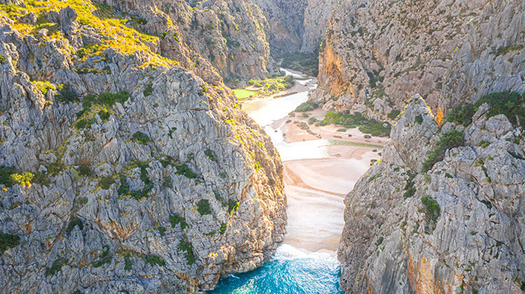 The Torrent de Pareis lies in the municipality of Escorca, in the northwest of Mallorca, right in the heart of the UNESCO-protected Serra de Tramuntana. The gorge starts where two streams meet: the Torrent de Lluc and the Torrent des Gorg Blau, a place fittingly called S’Entreforc (“the fork”). From there, the torrent descends for about 3.3 kilometres until it reaches the beach of Sa Calobra, one of the most beautiful coves on the island.